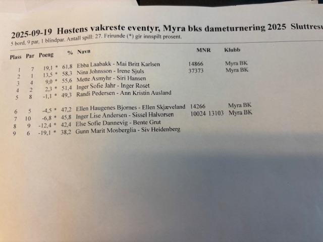 Det ble en gild kveld! Gode folk, god mat, god stemning, gilde spill! Kan det bli bedre? Årets vinnere ble Ebba Laabakk og Mai Britt Karlsen med smått imponerende 61,8%! Gratulerer! Her kommer også resten av resultatlista.