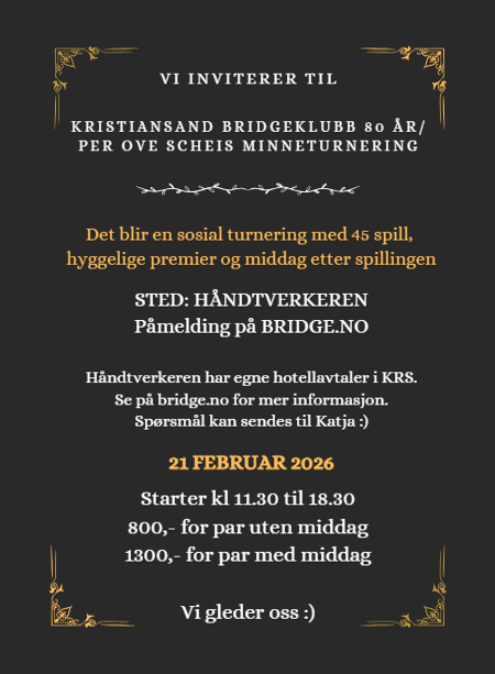 Kristiansand Bridgeklubb 80 år / Per Ove Scheis minneturnering
