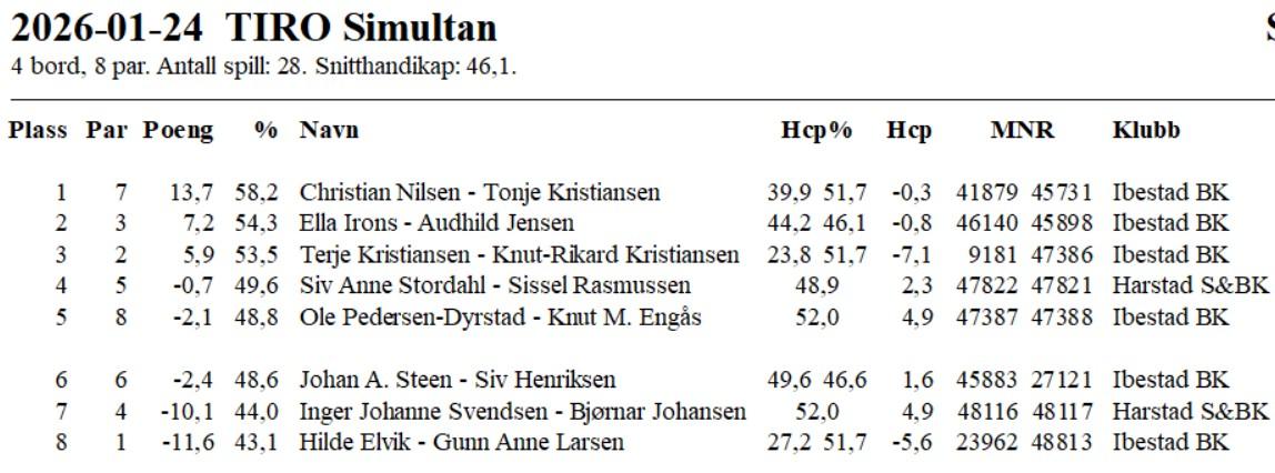 8 par stilte opp i vår TIRO simultan turnering på lørdag 24 jan.