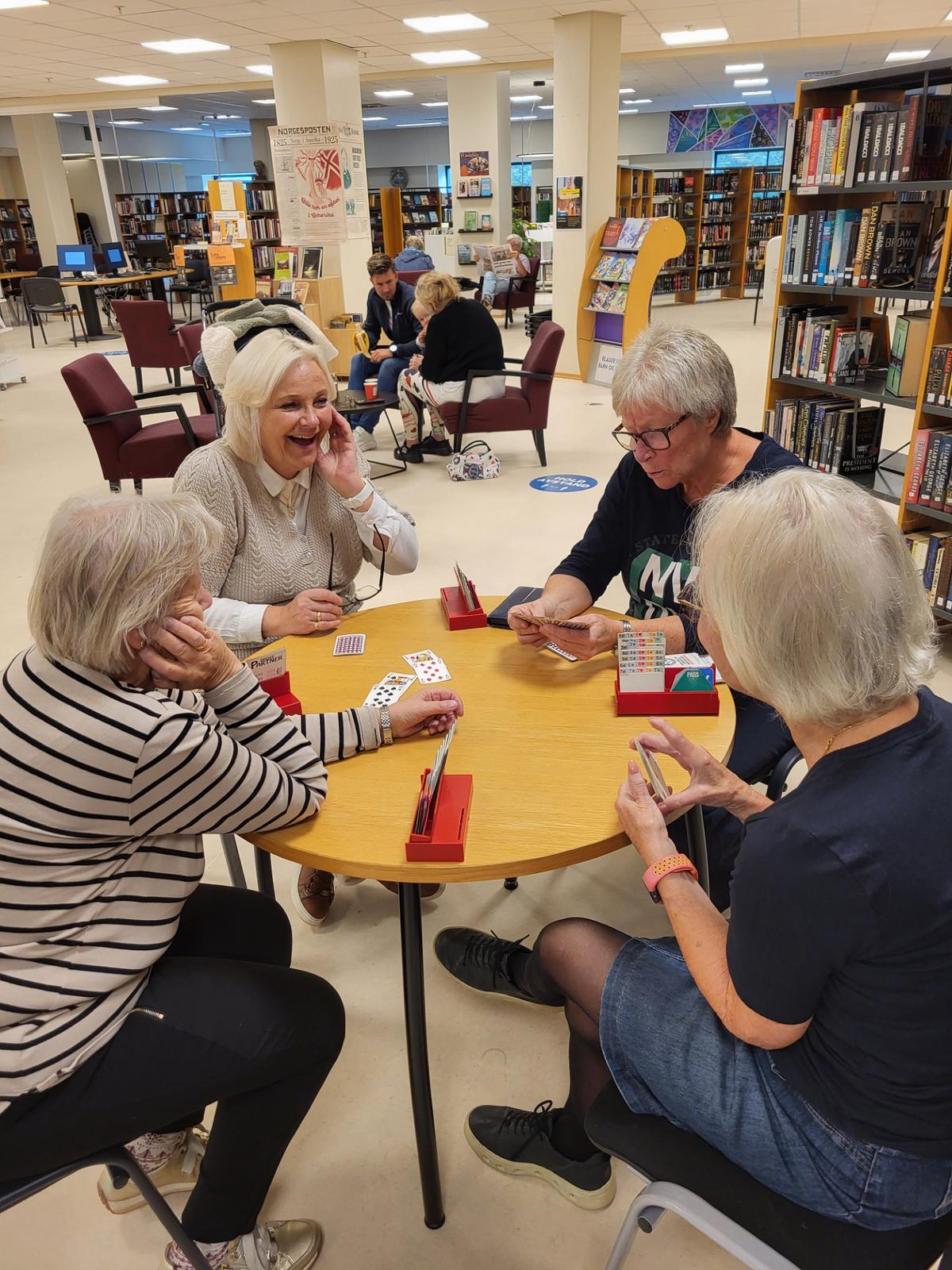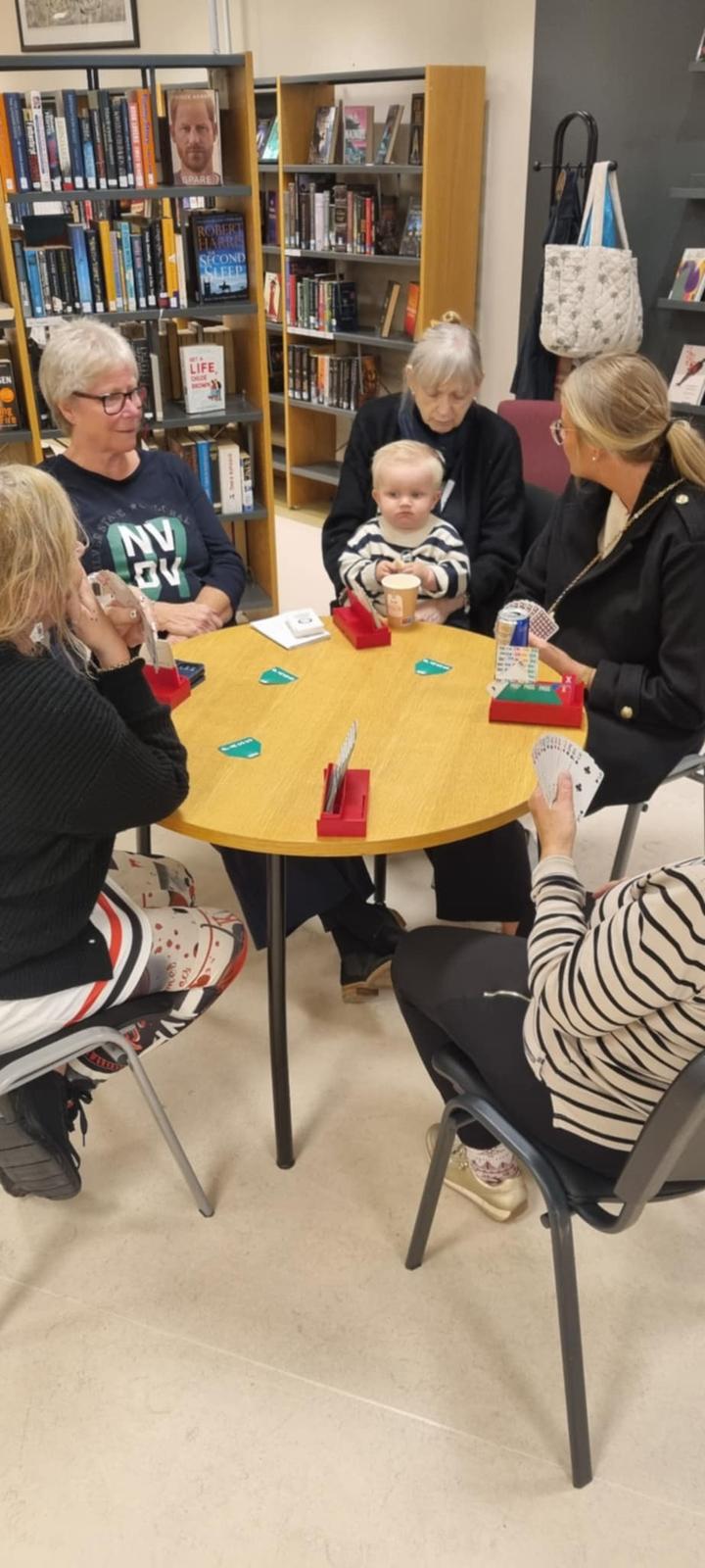 11 av Spardames medlemmer var i sving på biblioteket på bridgens dag. Vi hadde laget oss en stand rett ved inngangsdøren. Vi byttet på å sitte ved et bord og spille. Interesserte fikk tilbud om å sette seg ned for å spille noen spill. En tilskuer benyttet sjansen, og meldte seg samtidig på kurs.