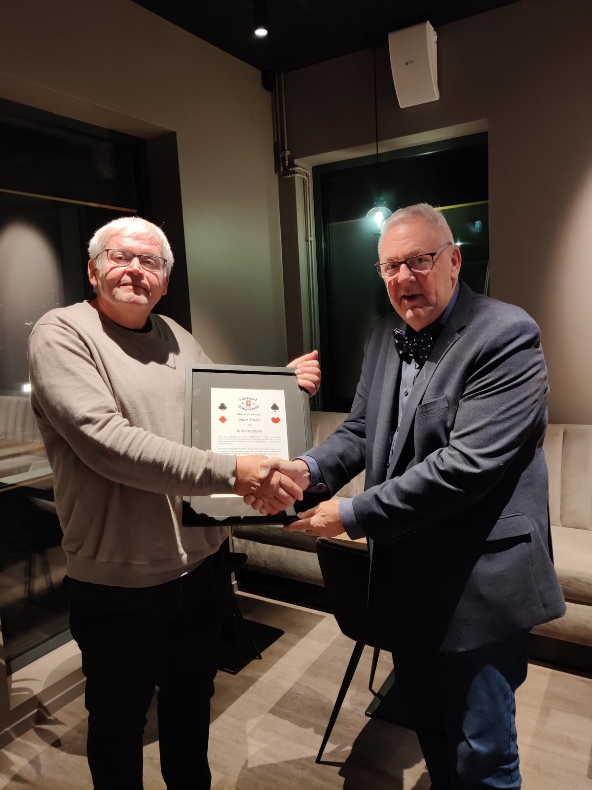 Vidar Smith (venstre) ble hedersmedlem i Vikersund BK for sin mangeårige innsats både i klubb, krets og nasjonalt. Leder Edvard Kristiansen (høyre) delte ut diplom.