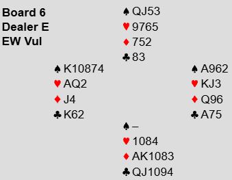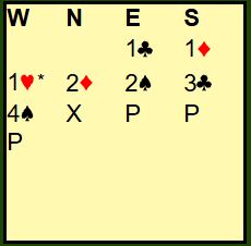 Ved det andre bordet meldte også syd inn 1 ruter med kort som kanskje enkelte ville sagt 2NT med (?) – begge minor. Men ved det bordet svarte vest 1 spar som naturlig melding. Dermed kom til slutt 4 spar (udoblet) på vest sin hånd ved det bordet, etter at syd også der fikk meldt 3 kløver i andre melderunde. Det ble altså nord som skulle spille ut der, og med en makker som hadde vist begge minorfargene ble det naturlig å prøve kløverutspill fra dobbelton. Da var det forsvaret som var ett stepp foran, og de rakk å godspille kløverstikk i tide - betestikket. Med +100 ved det bordet vant NORDNORSK MIX 14 IMP.