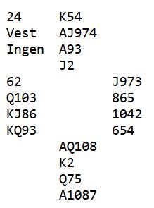 Vest har altså vist 9 HP i ruter så langt, øst 4 HP i kløver. Motspillerne skal fortsatt dele på 10 HP (spar konge, hjerter ess og kløver konge). Er det egentlig noen god grunn til å toppe fremfor å ta finessen når det er såpass god plass til at øst kan ha spar konge?