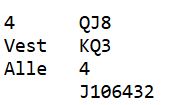 Spilles sånn rett etter nesen vinner vest i andre trumfrunde med spar dame og spiller en tredje runde trumf. Da går det ikke å unngå to rutertapere og en hjertertaper i tillegg til trumfstikk de fikk - en bet.