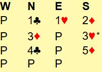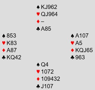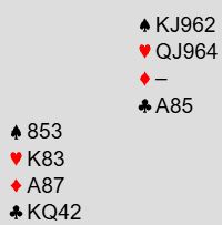Ved det andre bordet startet meldingene likt til 2 ruter, men nord meldte da 3 kløver, og syd spurte om hjerterstopper med 3 hjerter. Ødegård sa 3NT med sin single hjerter konge.