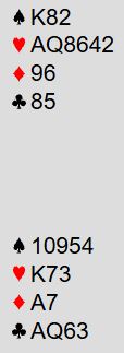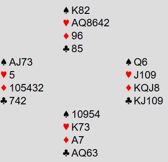 Nord skal altså spille 6 hjerter som er en bra kontrakt. Problemet er at det kan bli to hjertertapere, så det er faktisk bedre i grand- eller kløverkontrakt hvor det behøves kun to hjerterstikk for å å komme til 12 (2+2+3+5=12). Hva gjør du etter ruter knekt ut fra øst mot 6 hjerter?