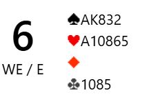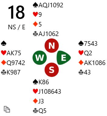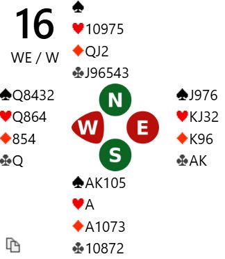 Vest har vist 9 HP allerede. Så å toppe fordi vest åpnet holder ikke helt som argument for å bestemme seg for å spille mot oddsen fargen sett isolert sett. Det er i teorien dobbelt så stor sjanse å ta finessen med ti trumf (mangler kongen) enn å toppe. Men fargekombinasjoner, prosenter og slikt må sees i sammenheng med hele spillets kontekst. Her er det imidlertid god plass til spar konge hos øst. Det er med andre ord et vanskelig valg.