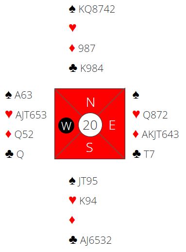 //Et skikkelig fordelingsuhyre. I slike spill er det fort gjort å tråkke feil! Det blir å spørre seg selv: skal det meldes enda en gang til, eller skal man la motparten spille sin kontrakt? Hvem har egentlig høyeste kontrakt?//