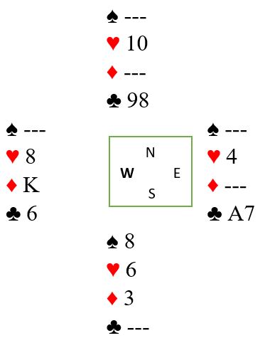 Mot Bård Kåre Græsli dekket ikke syd hjerter dame, og da er det ikke fullt så enkelt. Men Bård Kåre så hva som skulle til. Han tenkte det var sannsynlig at nord hadde kløverlengden. Så for at en skvis for det tolvte stikket skal kunne fungere må hjerterholdet overføres til nord. Etter hjerter dame hadde fått seile rundt spilte han derfor hjerter knekt! Den måtte syd dekke, hvis ikke er det tolv enkle. Så da den andre store hjerteren fra øst ble dekket og esset vant stikket var hjerter 8 den nest høyeste hjerteren. Da var det bare å innkassere sparstikkene fulgt av ruterstikkene. Idet den siste ruteren ble spilt så det slik ut: