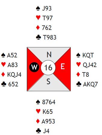 Ø/V har nesten nok til slem, men idet vest viser 12-14 balanserte bør de stoppe i 3NT. Nord spiller ut kløver 10 som stikkes hos øst. Så presses ruter ess ut. La oss si det kommer mer kløver til øst. Det blir enkelt to stikk i hjerter uten å slippe inn motparten. Så spillefører har 3+2+3+3= 11 sikre stikk ved å dra hjerter dame. Hvis syd dekker den blir det en ganske automatisk skvis mot nord fordi han blir alene om å holde både hjerteren (hjerter 8 er trusselen) og kløveren.