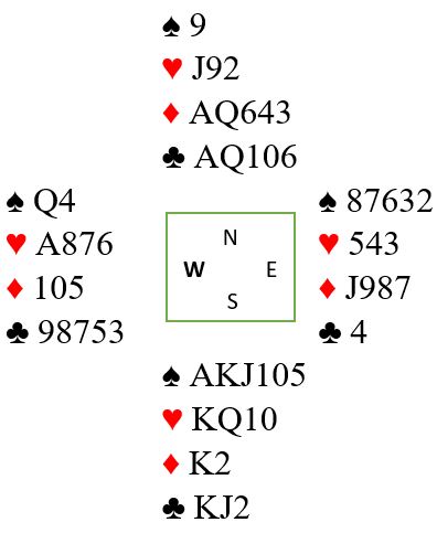 La oss si vi vinner kløverutspillet hos nord og spiller hjerter til kongen og vests ess.(Det ville blitt et spesielt spill om vest klarer å ligge unna to ganger med hjerter ess, men det lumske motspillet ser vi bort i fra i denne omgang). Idet vest har fått for hjerter ess slipper vi den kjedelige sparskiften fra øst, så vi har våre to hovedsjanser for det tolvte stikket i behold. La oss si vest spiller mer kløver (eller spiller hjerter), men det spiller ingen rolle hva vest spiller av hjerter, ruter og kløver idet han er inne på hjerter ess. Øst viser seg å ha startet med kun en kløver.