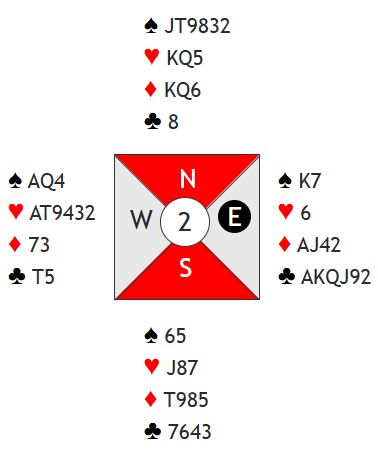 Øst åpner med 1 kløver, og vest viser hjerterfargen. Nå vil det antagelig komme en sparmelding fra nord. Øst bør reversere med rutermelding, og så spørs det hvordan det går videre. De fleste havner i 3NT med slikt, men hva med lilleslem i kløver?