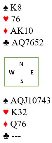 Kun hjerteren er et problem. En hjerter forsvinner fra syd på kløver ess, og om øst har hjerter ess blir det kun ett stikk til Ø/V. Det er imidlertid mye større sjanse enn den 50-50 sjansen i hjerter. Kløveren kan ofte godspilles med noen stjelinger. Om det ikke lar seg gjøre å godspille kløveren blir hjerter ess foran kongen siste sjanse.