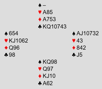 Beste slem er 6 kløver. For 6NT med tolv stikk fikk Heiberg-Evenstad og Lahrmann 88%. Christian Bakke og hans makker noterte 68% for å spille 6 kløver med hjemgang. Boye Brogeland og hans makker satt i mot kortene og fikk 80% da N/S tok elleve stikk i 4NT.