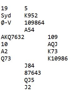 Jeg sa meldingsforløpet var underlig, men er det noe listig bak det der? Forklaringen jeg har fått på meldingsforløpet er at meldingene var naturlige opp til 4 kløver, bortsett fra åpnerens 2 ruter som kun er GF. Hvorfor meldte Thoresen sånn, dvs. støtte kløveren i stedet for å gjenta sparfargen? Vel, hun fikk satt kløver som trumf og fikk etter hvert funnet ut at øst hadde kløver ess eller konge, eller A-K i kløver. To nøkkelkort med kløver som trumf må jo være ett i kløver samt hjerter ess, eller A-K i kløver og i så fall mangler hjerter ess. Og om øst hadde hatt kløver både A-K og hjerter ess (tre nøkkelkort) ville åpneren kunne tatt sjansen på storeslem! Slik det ble fikk dette meldingsforløpet en uventet og nok utilsiktet effekt siden utspilleren ble "lurt" til å spille ut den fargen hele spillet handlet om i normalkontrakten 6 spar.