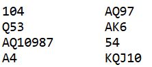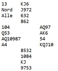 Nord er giver og alle i sonen. Nord passer, og både nord og syd forholder seg tause hele meldingsforøpet. Hva er beste kontrakt? Hvor god er eventuelt en slem i dette spillet?