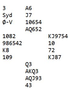 Det er sårbart om vest spiller ut spar. Man kan kanskje ta tre runder hjerter og kaste en spar (da må hjerter sitte 4-3) og så prøve minorfargen i tur og orden. For en av minorfargene må løses uten taper om slem skal kunne stå. Tilleggsopplysning om hvordan meldingene gikk ved mange bord er at øst melder inn spar. Meldingene gikk forskjellig rundt omkring, og flere steder ble det slem til slutt, syd skulle spille 6 ruter.