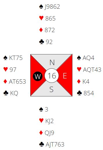 Øst og vest har begge balanserte hender, og de har 27 HP til sammen. Da blir det normalt spilt 3NT ved de fleste bordene. Det er imidlertid ingen god kontrakt om det kommer kløver ut, og det gjør det nesten over alt selv om vest er spillefører, for syd vil normalt ha fått meldt inn med kløverfargen. Da forsvinner stopperen i den fargen før spillefører har fått sjansen å godspille noen ekstra stikk. Og syd har som du ser både stopper i ruter og alt bak i hjerter. Det som gikk to bet i 3NT – og det var mange – behøver ikke skjemmes over det selv om det ga en god del under middels.
