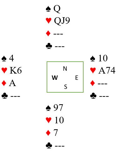 Det er ikke bare 3-3 i hjerter som er sjansen her. Det kan oppstå en skvis, og i så fall må det bli en skvis i hjerter og spar. Mange føler at skvis, innspill og slikt er veldig vanskelig. Det kan være det, men i noen tilfeller hvor en har resten av stikkene minus ett stikk kommer skvisen omtrent av seg selv hvis forutsetningene for en skvis er tilstede. Det viktigste er ofte å passe på å ha overganger til begge sidene.