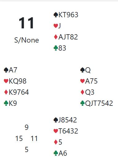 N/S kan vinne ti stikk i sparkontrakt, men da må sparen tippes rett. Det er imidlertid Ø/V som egentlig har kortene (26 HP til sammen), men de vinner ikke utgang om motspillet er korrekt. Kontrakten 5 kløver ser bra ut om en ser kun på Ø/V sine kort, men N/S kan få for ruter ess, en ruterstjeling og trumfesset - en bet. Hvis hjerteren hadde vært fordelt snillere ville også 4 hjerter vært en grei utgang. I 3NT kan det gå galt med spar ut. Så i realiteten er det Ø/V som stamper idet de er med til 5 kløver over en eventuell 4 spar meldt av N/S. Noen steder meldte nok Ø/V 5 kløver for egen maskin da det er en helt normal og bra utgang.
