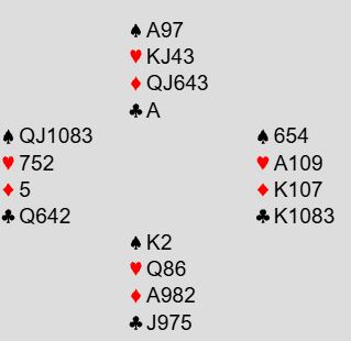 Merk nords (Tor Bakke) sin 1NT-åpning med 3-4-5-1 fordeling. Den åpningen er fornuftig etter min mening. Det er ikke fordi han vil være "tøff" eller noe, men fordi det etter å ha åpnet med 1 ruter kan bli et ekkelt gjenmeldingsproblem. Grandåpning med dette vil som oftest gå helt greit, og nord har fått vist styrken sin med det samme.