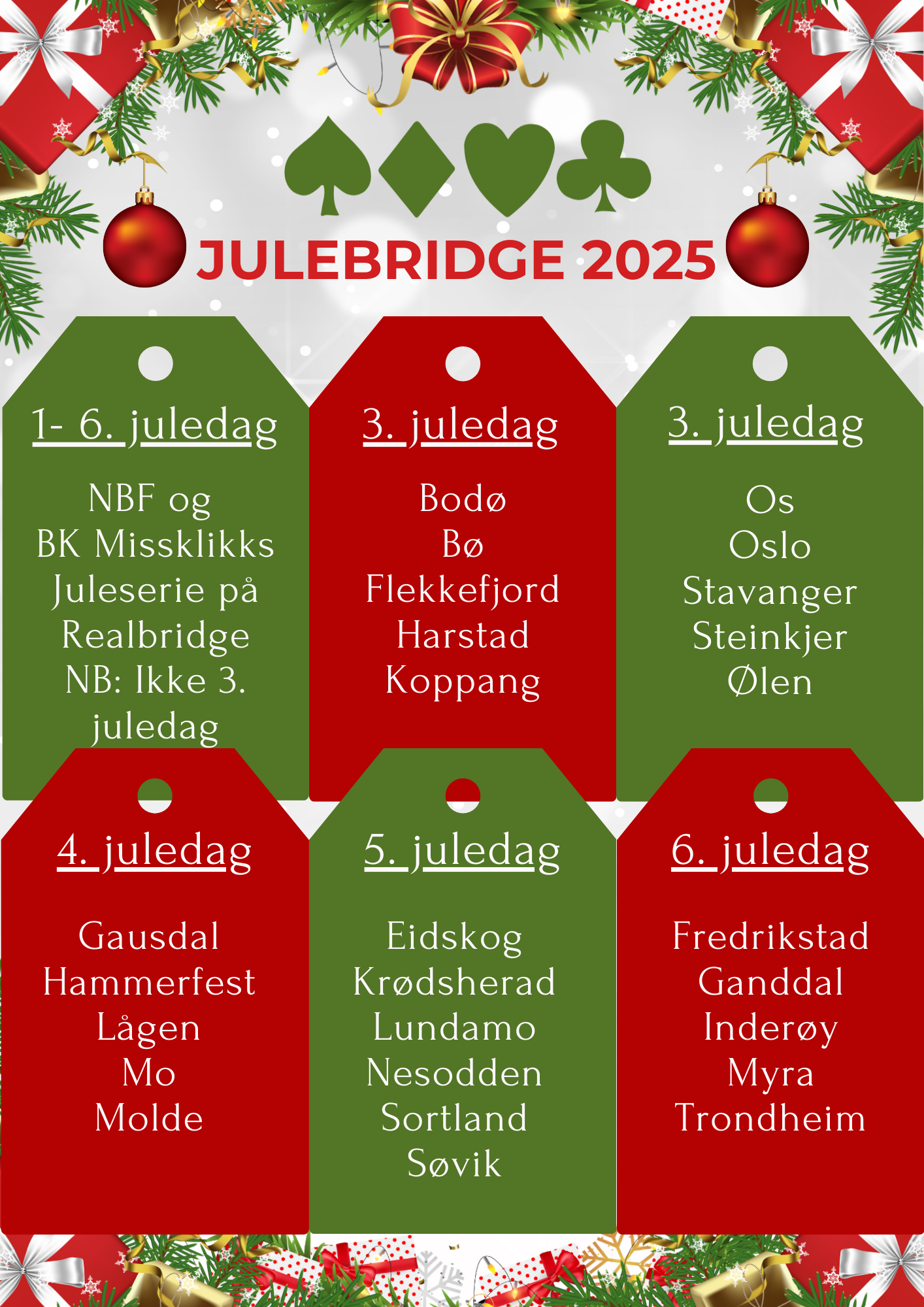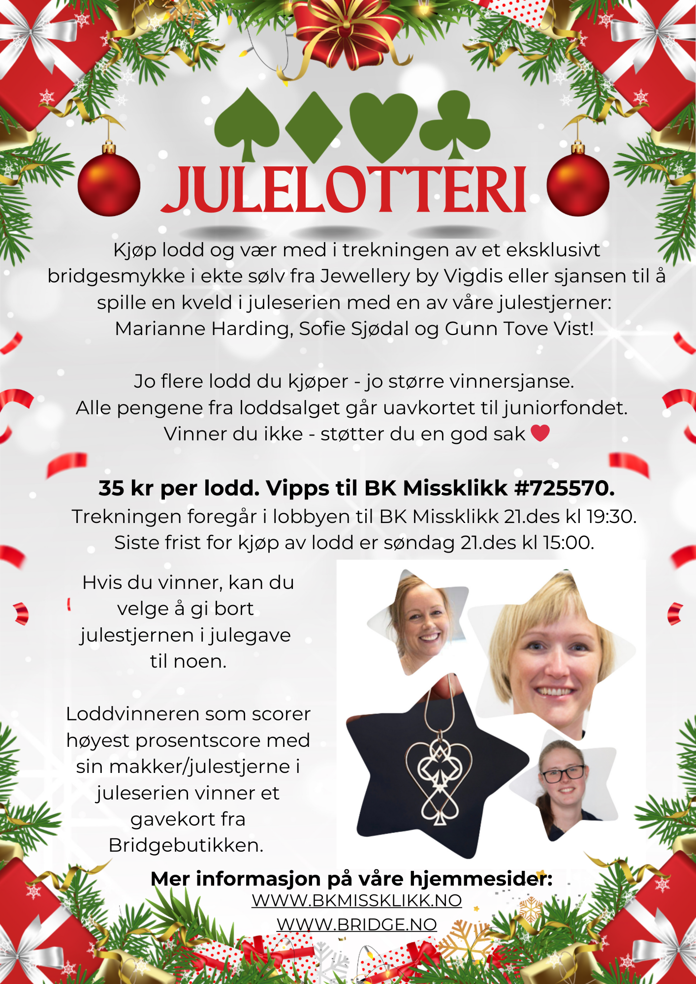 En annen tradisjon i jula er det å gi. Vi ønsker i samarbeid med BK Missklikk å gi deg en julegave i form av en online juleserie som spilles på Realbridge 1. - 6. juledag, foruten 3. juledag ettersom BK Missklikk har et annet program på lørdager. Spillingen starter kl 19:30, det er 24 spill hver kveld og du velger selv om du spiller en eller flere kvelder. Det blir gratis spilling 1. juledag, mens 2., 4., 5. og 6. juledag er spilleravgiften på 60 kr (juniorer spiller gratis). Det blir din julegave til juniorfondet og her er det lov å gi mer hvis du ønsker det. Vipps til 725570. BK Missklikk gir julegave i form av at de står for arrangementet og dets kostnader. NBF sponser serviceavgiften og premier i turneringen. Det betyr at alt som kommer inn på BK Missklikk sin Vipps-konto ifm turneringsserien går uavkortet til juniorfondet.