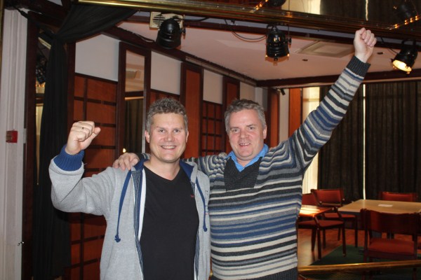 De fleste havnet i utgang på dette spillet og normalt i 3NT. Tommy (bildet) åpnet i Vest med 1 kløver og Gunnar i Nord passet, hvorpå Petter meldte en ruter som viser en ubalansert hand eller 9-11 og balansert hand. Harald i Syd hadde til 1 spar(!) noe som fikk øst vest til å unngå grandkontrakt når det ble støttet til 2 spar i neste melderunde fra Nord. Petter doblet som viste en makshånd og ingen egne meldinger hvorpå Tommy meldte 3 hjerter som ble lettet til 4.