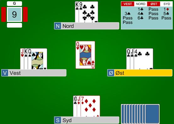 Haramgutten satt øst og var rimlig godt fornøyd med at Espen i Nord hadde kommet i 6 kløver etter et noe presset meldingsforløp. Etter utspill av spar seks så det jo nokså lovende ut. Espen stakk med trumf på hånden, la ned kløver ess og renonsen hos Tommy i Vest kom for en dag. Her er det flere som sløvt ville gitt opp og spilt seg for en beit, noe to par faktisk gjorde. Men - kontrakten står bare du klarer å sniffe opp fordelingen som skal til i Øst for at du har 12 før motparten har 2. Espen vurderte det slik at utspillet var ekte (norsk) og gikk derfor for følgende kortføring med trumreduksjon og barbering av Petter. Frem til denne posisjonen hadde Espen etter kløver ess spilt; Hjerter ess og konge og hjerter til stjeling, spar til stjeling og tre ganger ruter med spart til stjeling hjem. Da har vi posisjonen i diagrammet under....
