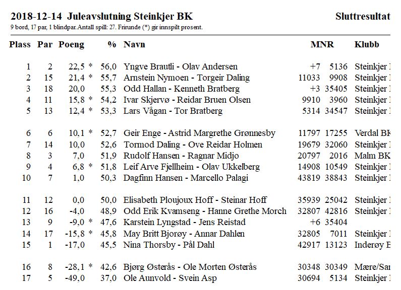 andre runde av Vinterturnering 2. Gunnleiv og Kjetil vant med 70 %. Andreplassen gikk til Stig og Tom Ivar, og de fikk 55,0 %.