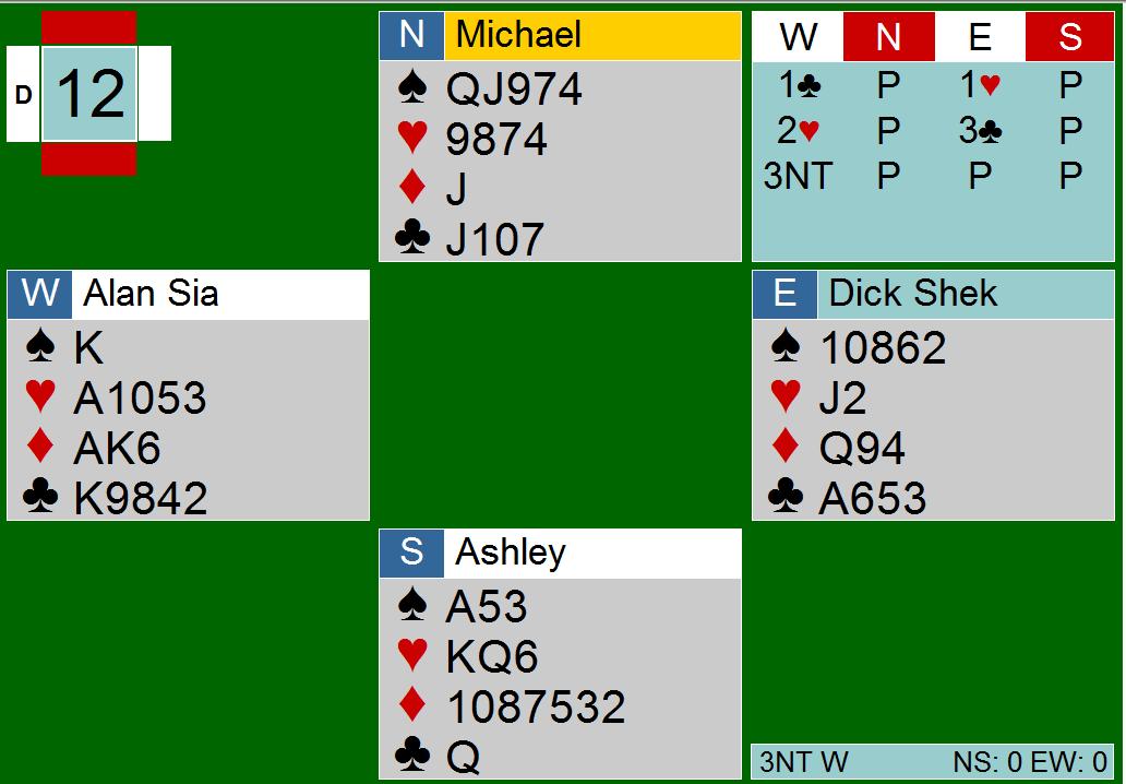Nå vet vi det. I dag spiller han 48th Asia Pacific Bridge Federation championship for Malaysia mot New Zealand og på spillet under kom de i 3NT etter at makkeren åpnet i en kløver som ble alertert og Dick svarte 1 hjerter som sikkert viste 4 spar, hvorpå han løftet makkers 2 hjerter til 3 kløver og makkeren avsluttet med 3NT.
