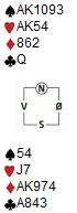 I spill 11 satt jeg nord og dro opp en hånd med to renonser og 8-5 fordeling i minor, utgang i kløver på egen hånd. S var giver og ingen i sonen. Før min tur hadde makker Helgesen åpnet med 2 spar, Romersk/Tartan som lover 5-5+, og styrke under åpning, altså ca 6-10/11 HP. Jeg så for meg 5-5+ i major, men da V meldte inn 3 hjerter tor jeg like godt til med 5 kløver. Deretter fortsatte ballet!