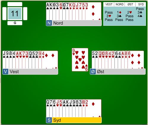 I siste runde mandag møtte vi Karl Magnar, som i tredje hånd åpnet i 1 ruter. Vi gikk freidig inn med 2 hjerter som viste en svak enseter, hvorpå Helge introduserte sin kløverfarge på tretrinnet. Bavianen fightet nå med 3 hjerter. Karl Magnar meldte 3 spar(!) og Helge i syd letta til 4 spar.