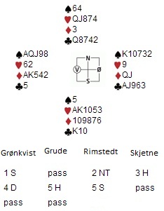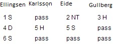 As you see, the biddings was the same on both table, except that Sweden stopped in 5 spade. If Eide choose to dbl 5 heart, it would have showed a hand with minimum, so now 5 spade from Eide made it easier for Ellingsen, because it looked like partner was short in heart, and he could raise to 6 spade. This kind of boards is decisive in short matches as here in the Nordic Championship.