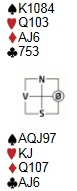 Kløverdamen ut til kongen og nå sto det hele på rutervalget. Åpneren har helt sikkert ruteresset, men det var plass til en dame på den andre siden. Derfor ruter til kongen og mer ruter var et heldig valg og +430 på bok.