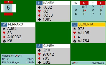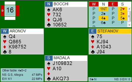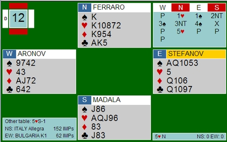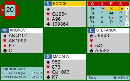 Jeg mener at Italia spiller 15-17 i alle soner, i alle fall er det det som står på systemkortet. På den annen side bløffer sjelden spillere på NT-intervallet med balanserte hender, så de har sikkert endret. 3ru viser kløver, mens 5sp ber makker se på kvaliteten på sparen. Faktisk står 6kl/7kl og 6sp på omtrent det samme, nemlig at sparen løser seg uten taper. I alle fall med hjerter ut. 6kl var gevinstspill siden Bulgaria ikke kom lenger enn til utgang.