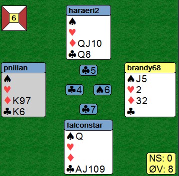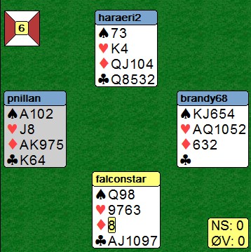 Ernst & Young prisen 2014 til Finn Brandsnes? Skrevet 03. desember, 2013 av Snorre Aalberg Jeg liker å vandre rundt på BBO og kikke på kjenningene mine spille kort. Titt og ofte ser jeg flotte prestasjoner, men den i går var over gjennomsnitt for å si det mildt. Her er kortene: Jeg fikk ikke med meg meldingsforløpet helt, men øst hadde cuebiddet kløver som syd doblet. Kløveresset er derfor plassert. Finn sitter i øst og skal spille 6sp med ruter åtte i utspill. Bordet vinner med esset og nord legger toeren. Allerede nå ser du at ruteren sitter 4-1. (norske utspill) Med åpne kort ville jeg spilt slik: Hjerter knekt til konge og ess. Spar til tieren og spar ess. Hjerter til hånda og en hjerter til stjeling. Hjem på kløverstjeling og ut med trumfen. Det blir en rutertaper til slutt: Skrivebordsbridge nesten vil jeg påstå!! En mer normal spilleføring ville vært EK i spar for å se om damen falt. Så hjerterknekten til kongen og esset. To høye hjerter for å se om den fargen satt 3-3. Da forsvinner tre ruter i bordet og en ruterstjeling sikrer det tolvte stikket. Det hadde gått galt denne gangen og kontrakten ville gått beit. Finn fant en fantastisk spillføring slik sitsen var. Han vant med ruteresset, spilte hjerter knekt til konge og ess. Så spar til esset og spar konge. Hjerter dame og hjerter ti. Da nord ikke hadde mer enn to hjerter var planen med å kaste ruter i bordet dødfødt. Finn stjal god hjerteren og røffa seg hjem i kløver. Nå er stillingen som under: Et "vanlig" innspill medfører at motspilleren tvinges til å spille til dobbelrenons eller opp i en finesse. Se hva som skjedde når syd fikk komme inn på spardame!! Kløveresset godspilte kongen og ga avkast for rutertaperen. Nesten magisk, spør du meg!! Legg til kommentar