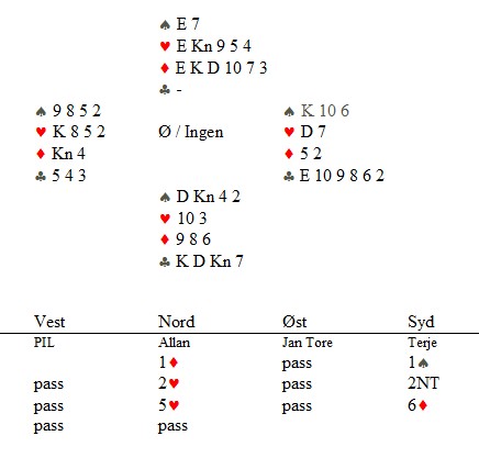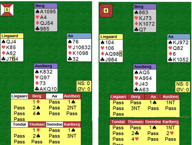 Det var mange interessante hender, hvorpå undertegnede og Ole har funnet ut at man må gjøre noen justeringer på systemet. Det er ofte man dukker opp i situasjoner som gjør ting vanskelig, disse situasjoneene burde man analysere, samt se om det er noe man kan gjøre for å ta tak i dem. Jeg har hele tiden sagt at man ikke må diskutere posser basert på hender, dvs akkurat den hånda man har forran seg osv. Det man derimot kan diskutere/justere er situasjoner som oppstår, dvs når motparten melder inn det eller det, eller når man sitter å spiller et motspill, ikke analyser det ene spillet alene, men diskuter hva de forskjellige kastene skal vise. Igjen på et generellt nivå, ikke HÅND FOR HÅND.