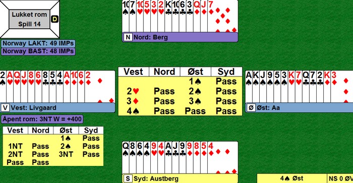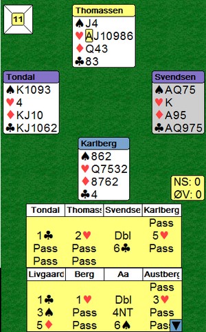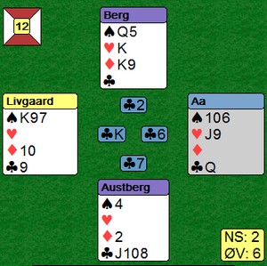 Jan Tore Berg har et vanskelig utspill og starter med spar to til makkers ess som skifta ruter seks. Bordet vant, kløver til esset og hjerter til dame, hjerter ess og mer hjerter.