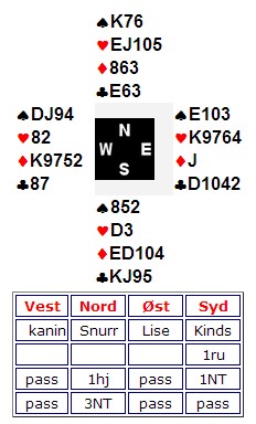 Skal prøve å finne spill noe senere, men kan si det slik; Vi reddet kvelden til Ivar og Eivind på siste bord. Selv om de fikk litt over 40% totalt, så knuste de oss.(vi hjalp godt til) Da ble de så glade at totalscoren spilte ingen rolle lenger