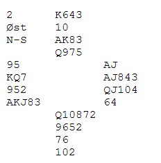 No har Sam Inge ikkje råd å trumfe sparen for i så fall får syd ein høyning når ein skal stele seg heim i kløver. Difor hjarter mot bordet. At ikkje syd trumfa ruter 10 saman med at om det er 109 blokk i hj hos nord, så har vi ein posisjon for begrensa val gjorde at han tok finessa med hjarter 7 (!). Deretter kløver til høg steling og bordet står. Svært nøyaktig speleføring!
