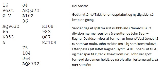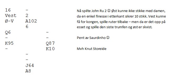 Motparten har kommet i 6sp. Der har du fem kort i mot og ellers INGEN stikk, verken i medspill eller motspill. Likevel melder Geir 7kl, til tross for at han ikke har den ringeste peiling på hvilke kort makker har !! Tor går sine 800, men det var en glimrende stamp mot 1430 på det andre bordet. Der kom de riktignok i hjerterkontrakt på vest sin hånd, men 6sp er også ubetelig,