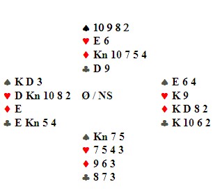 I kampen mellom Hammerfest og Lyngen kom begge bord i 6 kl, og som vi ser må kløverdama finnes. Ved vårt bord la spilleføreren fra Hammerfest ned kløver konge og kløver til esset, og dama stupte.