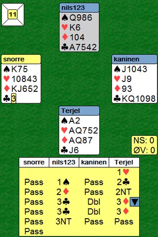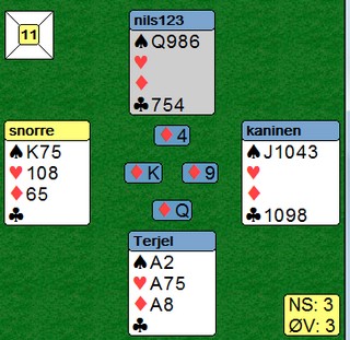 Så ruter til knekt og dame, Geir tok for hjerterknekten og burde kanskje spilt kløver, men spar var ok. Nils hadde ikke forbindelser og stakk med spar kongen i possen under. |