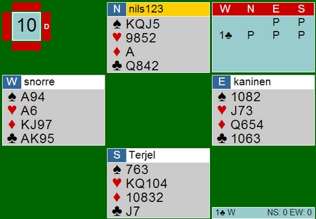 Jeg tenkte at hvis det er en som har fire ruter, er det i alle fall ikke han som la åtteren. Derfor le jeg ned knekten og kontrakten kunne ikke vinnes lenger når Nils stjal med åtteren.