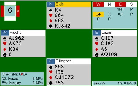 Scoren 1160 er ikke den mest kjente, men det er 2klxx med et overstikk i sonen. Den måtte de Harald og Kristian betale ut etter å ha doblet Stayman. Det gjorde ingenting siden Christian og Kristoffer på det andre bordet lett meldte 6hj. En syver inn!