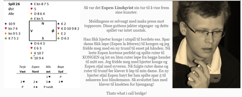 Undertegnede har spilt bridge, fredag, lørdag, søndag, mandag, skjærtorsdag og skal spille på langfredag og 2 påskedag.... Så langt har ikke resultatene vært de beste, men Jessheim har helt klart vært med å sette farge på flere turneringer.