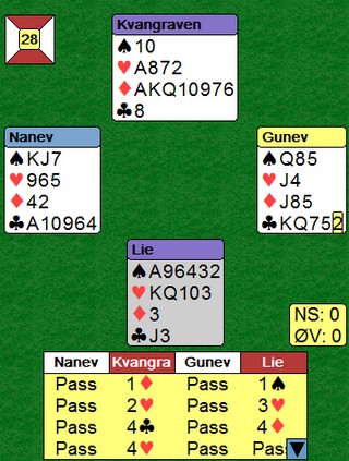 Det er ikke mange høydepunkt å skrive om i kampen, men her er et steinhard utgang fra Terje og Nils. Jeg tror ikke Terje mente å vise noe spesielt tillegg, men Nils kunne nesten ikke noe annet enn å løfte til 4sp. Ruterfargen var plassert og når trumfen satt fint og kløverdamen i kapp, ble det +420 til Norge.