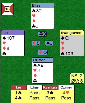 På kløver fra bordet kaster syd hjerteren sin og håper at makker har spar 10. Det er selvsagt feil tenkt, fordi hvis så er tilfelle vil spar ni stå når han bruker den.