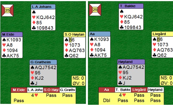 Jeg vet ikke om Tormod Røren skulle dobla 4hj. Han vet at det er masse beit der, men på den annen side kam motparten ha en annen kontrakt som er mye bedre. Øyvind Saur hadde store ekstra ressurser for sin 4kl. Det er lett i etterkant å si at Tormod skulle doblet, men la nå oss si at motparten hadde ti stikk i spar som de flykta til. DA hadde vi ledd av landslagskapteinen da!!