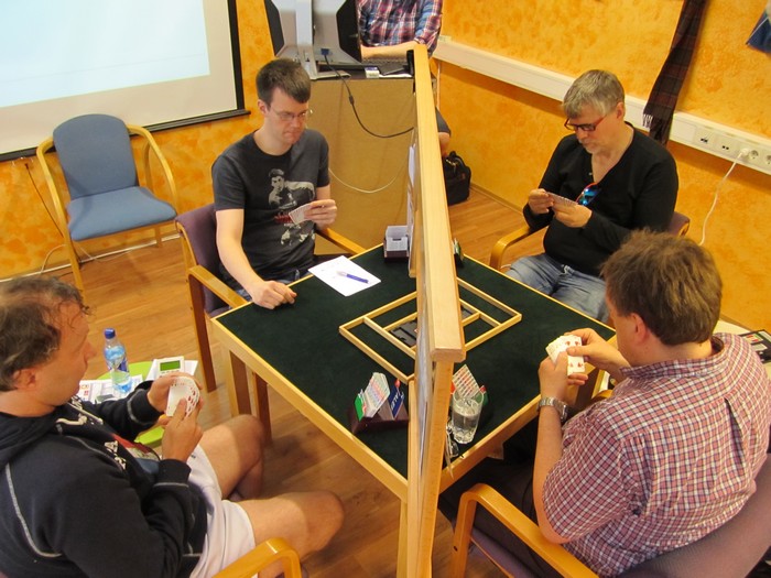 På det andre bordet er utspillet også hjerter til kapp, men Erik Berg spiller i stikk to spar til tieren som holder og kan så gå tilbake til ruteren. Det ender med 10 stikk og 12 IMP til Trøndelag.